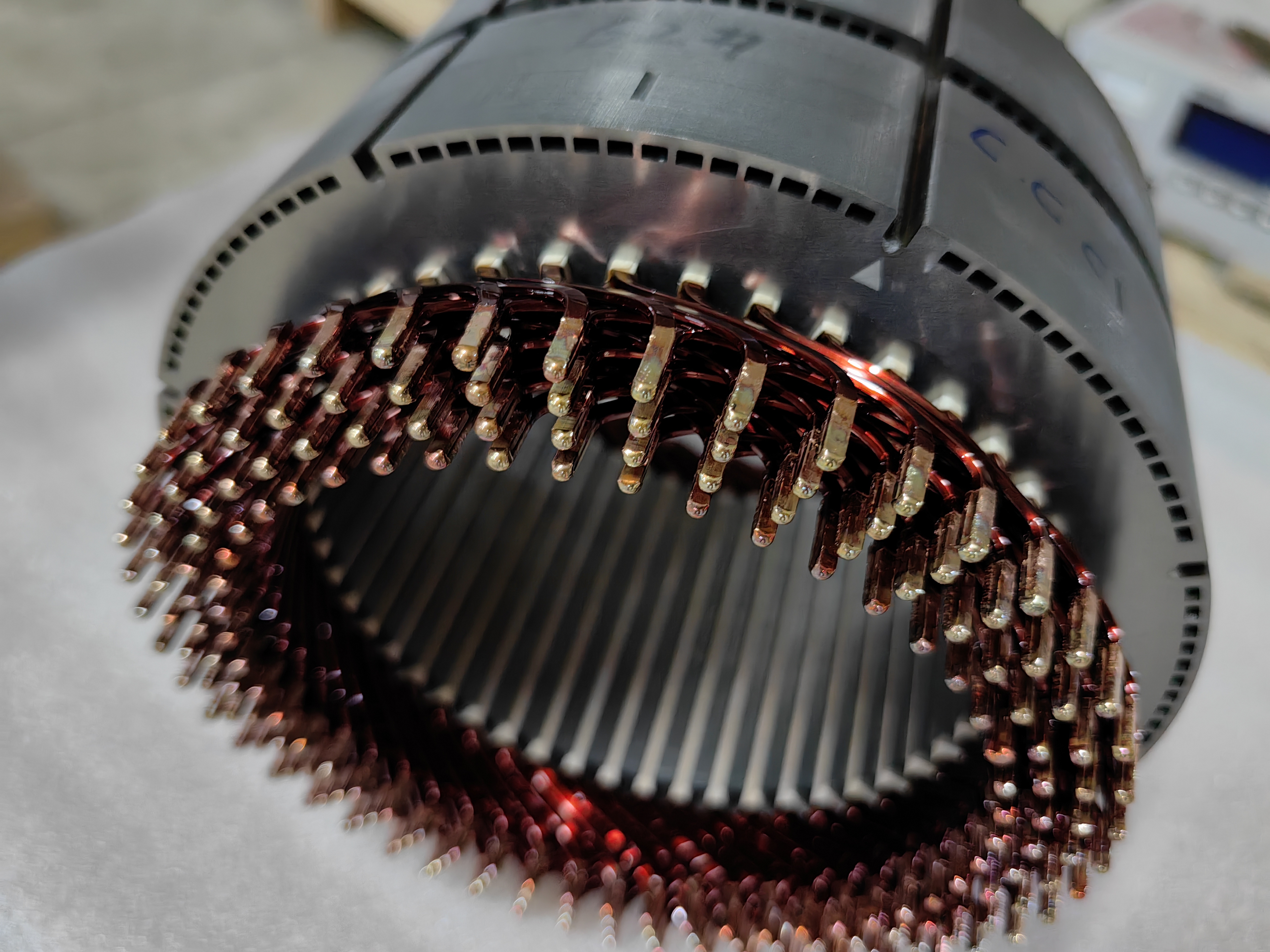 (1)鐵芯上絕緣紙(B形、S形、O型)→(2)漆包扁線下線去漆成U型→(3)異形線定長下線去漆→(4)異形線成型→(5)星點線焊接→(6)人工預插線入定子鐵芯→(7)線圈整形壓入鐵芯→(8)非出線端自動伺服扭頭并自動消除回彈角→(9)非出線端線頭自動切平→(10)非出線端自動TIG焊接→(11)三相引出線焊接。